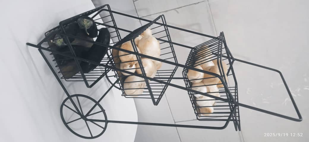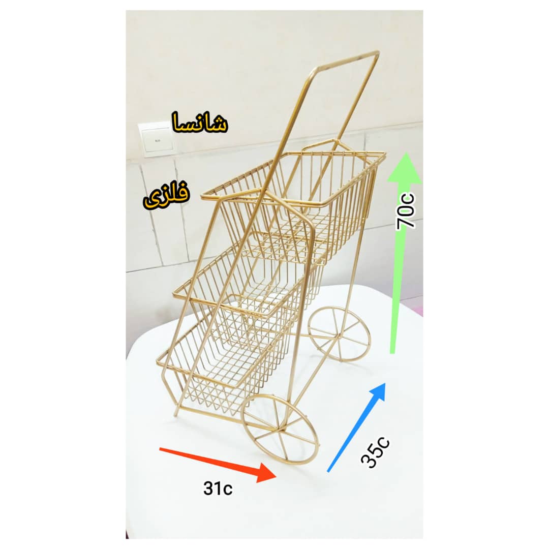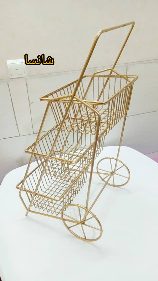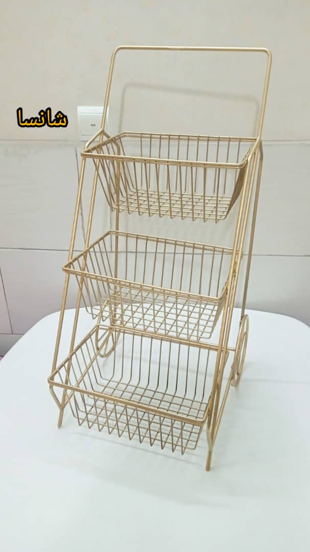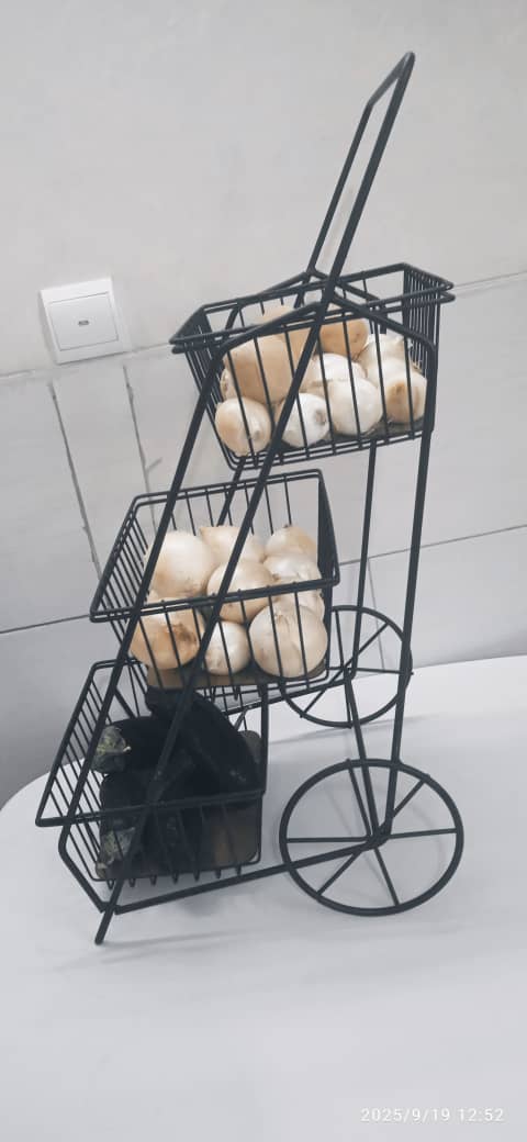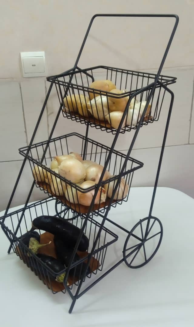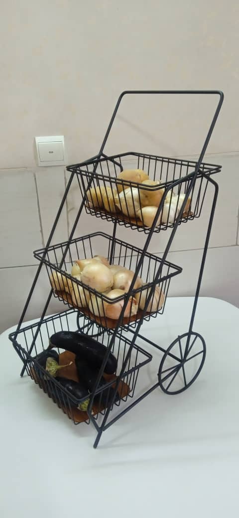جا پیاز سیب زمینی 3 طبقه فلزی طرح کالسکه ای دارای اسکلت فلزی مشکی رنگ همراه با سه محفظه مستطیلی با کفه چوبی با دسته و پایه فلزی طرح چرخ مشکی این محصول قابل استفاده در لوازم آشپزخانه جهیزیه عروس بوده و مناسب استفاده در محیط آشپزخانه، آرایشگاه، خیاطی و … می باشدودرهرطبقه حدود دو نیم کیلوفضا دارد.