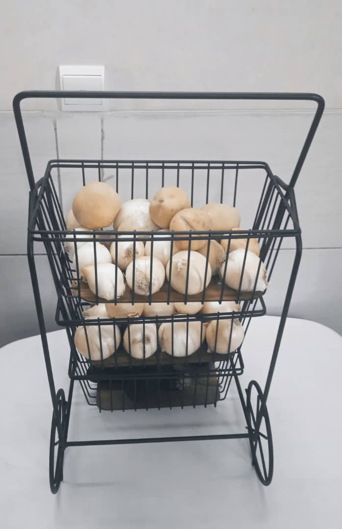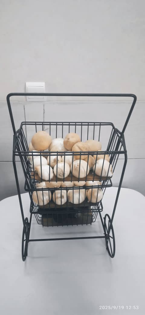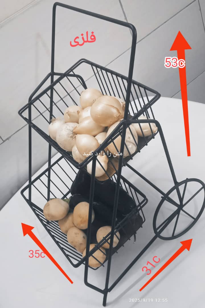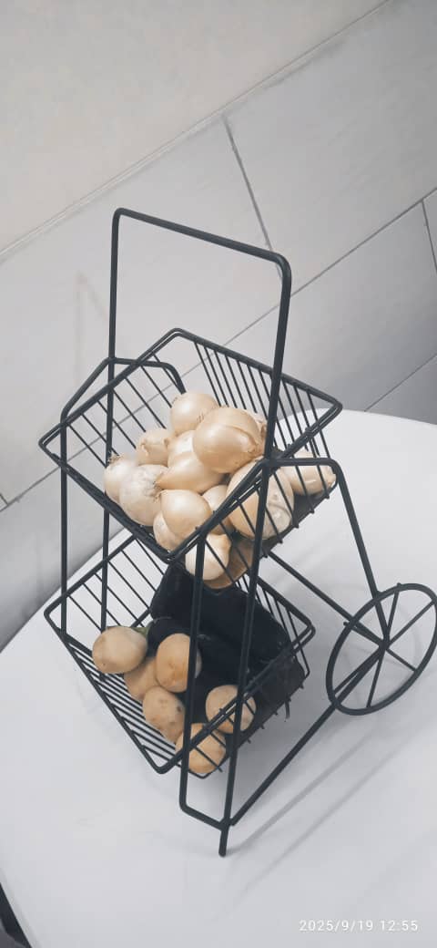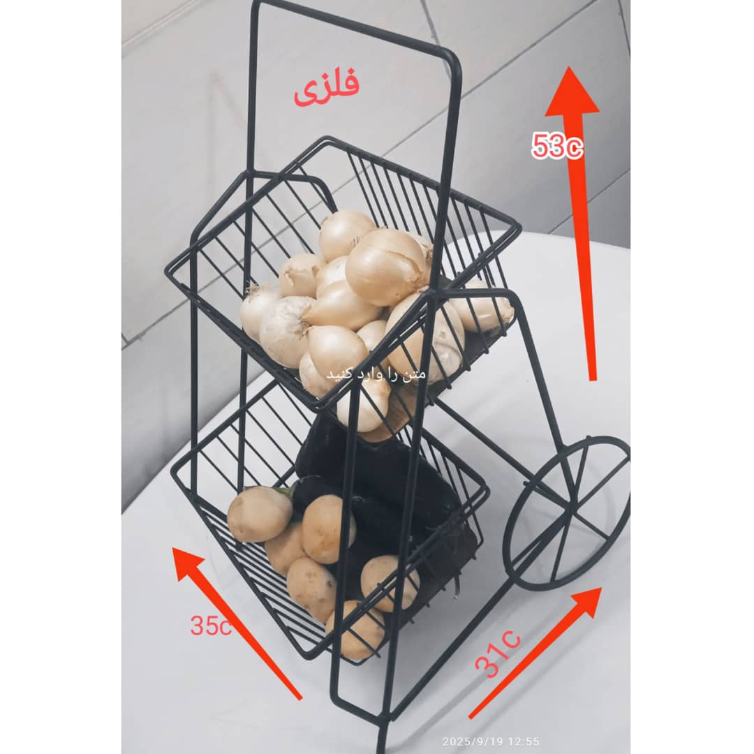 سبدسیب زمینی وپیازطرح کالسکه دوطبقه که ازجنس فلز محکم ساخته شده وباطراحی خوب وگردش هوا ی مناسب بین طبقات باعث سالم ماندن انها میشوداین سبدباظاهری زیبا به اشپزخانه شما زیبایی سبد سیبزمینی و پیاز با طراحی مدرن جداشونده که حدوددونیم کیلو جادار ودررنگ مشکی موجودمیباشد